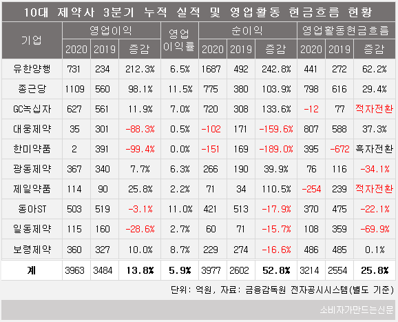 금융감독원 전자공시시스템에 따르면 10대 제약사의 올해 3분기까지 영업활동 현금흐름은 총 3214억 원으로 전년 동기보다 25.8% 증가했다.
