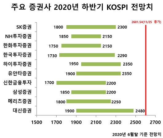 당시 증권사들은 상반기 코로나19로 망가진 경제가 정상화 기점에 접어들면서 상향조정을 받고 유동성이 강화된다는 긍정적인 전망을 내비쳤지만 코로나19의 예측 불가능성이 여전히 크다는 점에서 보수적인 성장곡선을 예측했다.