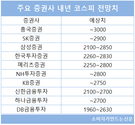 신한금융투자가 1700~2200포인트를 예측해 가장 보수적으로 시장을 예측했고 대신증권이 1900~2480포인트를 예측하며 현 코스피 지수와 가장 근접한 수치를 제시했다.