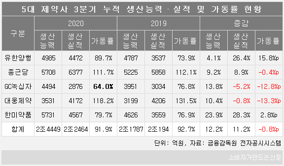 5대 제약사 중 가동률이 가장 낮은 곳은 GC녹십자다. GC녹십자는 생산능력이 13.8% 증가했으나 생산실적은 5.2% 감소하면서 가동률이 76.8%에서 64%로 12.8%포인트나 떨어졌다. 생산실적이 3000억 원을 밑돈 곳은 5대 제약사 가운데 GC녹십자가 유일하다.