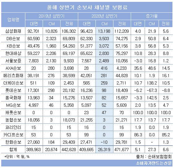 30일 손해보험협회에 따르면 올해 상반기 손해보험사 16곳의 CM채널 원수보험료는 2조6319억 원으로 지난해 상반기 2조674억 원보다 27.3% 급증했다. 대면채널 원수보험료도 40조9665억 원으로 전년 대비 5.1% 증가했지만 온라인 채널 성장세가 훨씬 두드러졌다.