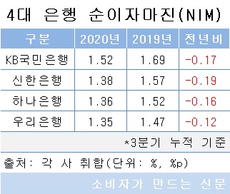 국민은행은 지난 분기 실적 발표 컨퍼런스콜을 통해 “올 4분기 순이자마진은 1~2bp 정도 추가 하락이 예상된다”며 “연간 NIM은 최소 1.5% 수준으로 관리하겠다”고 밝혔다.