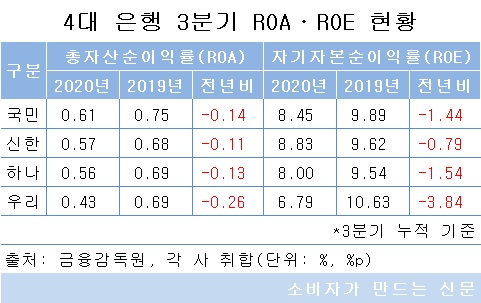 금융권에 따르면 지난 3분기말 기준 국내 4대 은행의 ROA·ROE는 전년 동기에 비해 일제히 하락세를 보였다.