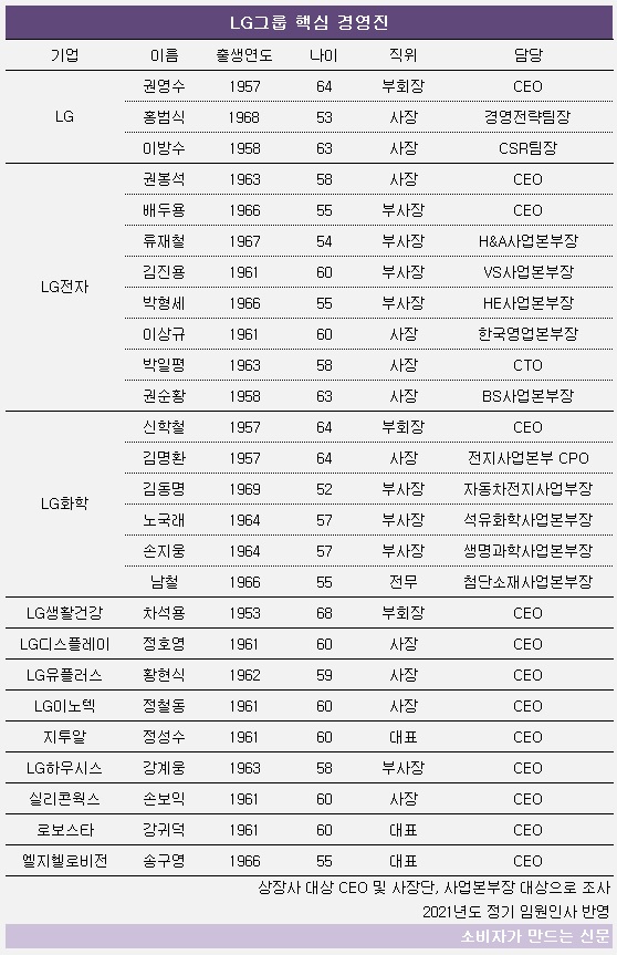소비자가 만드는 신문이 LG그룹 12개 상장사의 대표이사와 사장단, 사업본부장을 대상으로 조사한 결과 이들의 평균 나이는 2018년말 60.9세에서 2019년말 59.6세로 낮아졌고, 올해 연말 정기인사 후에는 58.9세로 더욱 낮아졌다.