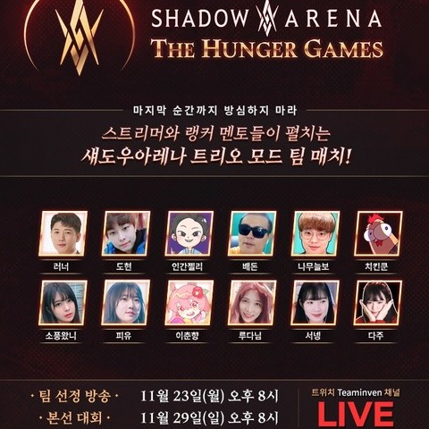 헝거게임은 온라인으로 시청할 수 있으며 트위치 인벤방송국 채널을 통해 생중계될 예정이다.