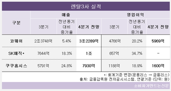 이들 두 업체의 4분기 전망도 밝다. SK매직은 올해 매출 1조원 돌파를 앞두고 있으며 쿠쿠홈시스는 매출 7930억 원, 영업이익 1600억 원을 달성할 전망이다.