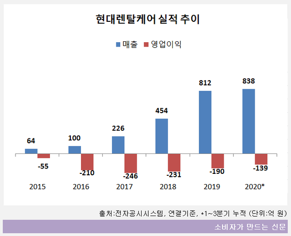 현대렌탈케어의 매출 추이를 살펴보면 2015년 64억 원, 2016년 100억 원, 2017년 226억 원, 2018년 454억 원으로 꾸준히 증가하다가 지난해 812억 원으로 급등했다. 올해도 3분기까지 838억 원의 매출을 올리며 지난해 연간 매출을 이미 추월했다.