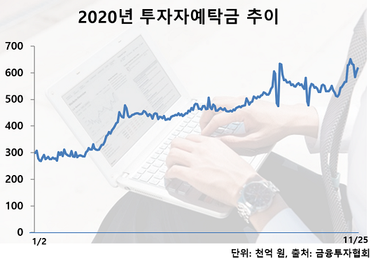 금융투자협회에 따르면 투자자예탁금은 11월 25일 기준 61조6000억 원으로 연초 대비 2배 이상 급증했다.