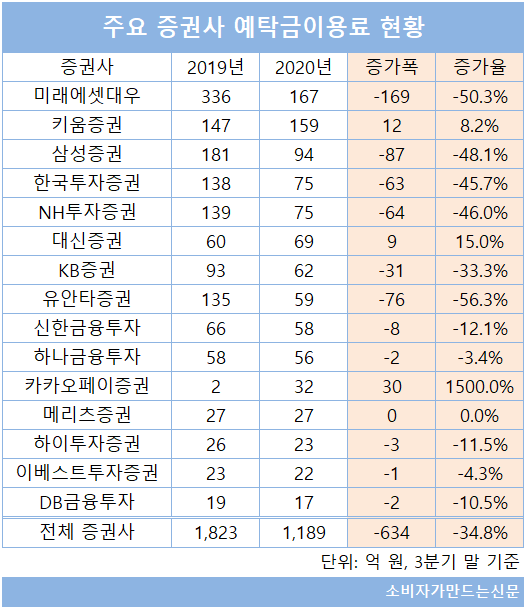 15개 중 11개 증권사의 예탁금이용료가 감소했는데 개인 고객이 많은 대형사의 감소폭이 두드러졌다.