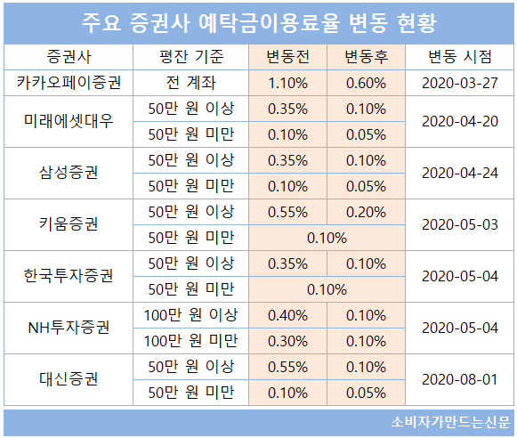 미래에셋대우는 지난 4월 20일부터 평잔 50만 원 이상 계좌에 적용하던 금리를 종전 0.35%에서 0.1%로 0.25%포인트 내렸고 삼성증권(대표 장석훈)도 4월 24일부터 평잔 50만 원 이상 계좌 적용 금리를 동일하게 내렸다. 한국투자증권(대표 정일문)과 NH투자증권(대표 정영채)도 5월 4일부터 각각 예탁금이용료율을 0.25~0.3%포인트 내렸다.