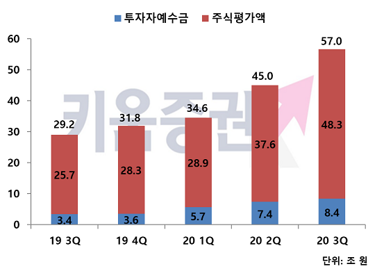 키움증권은 올해 3분기 말 기준 투자자예수금 규모가 8.4조 원으로 전년 대비 약 2.5배 늘었고 주식평가액을 포함한 고객예탁자산규모는 같은 기간 29.2조 원에서 57조 원으로 2배 가까이 급증했다.