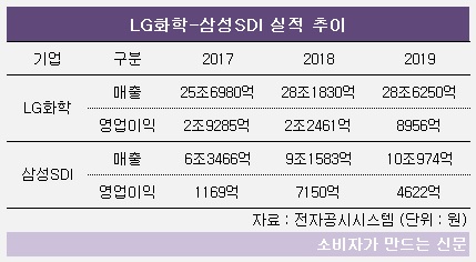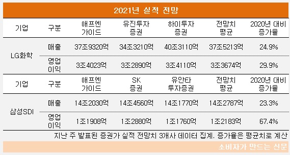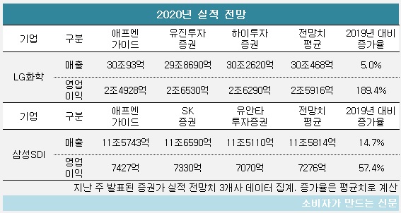 LG화학과 삼성SDI 실적 전망치는 각각 지난 주 발표된 증권가 리포트 3개사 데이터를 취합했다.