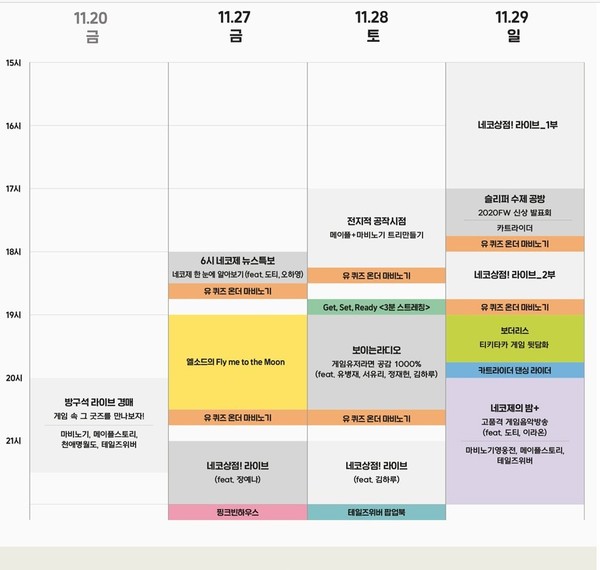 축제 마지막 날인 오늘 △오후 3시 '네코상점! 라이브_1부'를 시작으로 △오후 5시 '2020 FW 신상 발표회: 카트라이더 수제 슬리퍼' △오후 6시 '네코상점! 라이브_2부' △오후 7시 '보더리스(Borderless): 티키타카 게임 뒷담회' △오후 8시 온택트 게임음악 공연 '네코제의 밤+' 등 다양한 프로그램이 진행된다.
