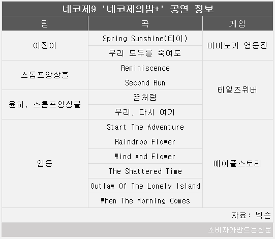 '네코제의 밤+'은 메이플스토리, 테일즈위버, 마비노기 영웅전 등 넥슨 IP를 재해석한 다양한 장르의 게임 음악 공연이다. 가수 윤하, 이진아, 런치패드 연주가 임둥이 무대에 올라 공연을 펼친다.
