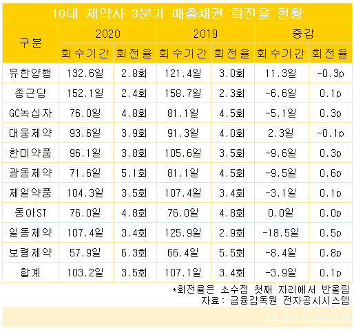 10대 제약사의 매출채권 회전율은 올 3분기 연결 기준 평균 3.5회로 전년동기 대비 0.1회 포인트 증가했다. 회수기간도 3.9일 줄어든 103.2일을 기록했다.