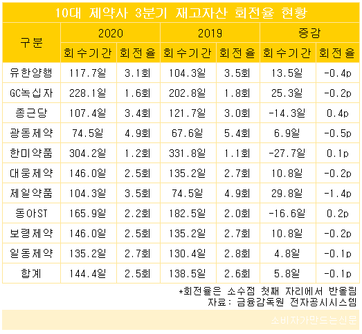 금융감독원 전자공시시스템에 따르면 10대 제약사의 올 3분기 연결 기준 평균 재고자산 회전율은 2.5회로 지난해 같은 기간 대비 0.1회 포인트 하락했다. 재고자산 회수기간도 144.4일로 전년 동기에 비해 5.8일 늘어났다.