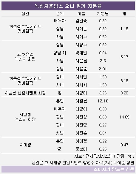지배구조의 정점에 있는 허일섭 일가는 측근 임원의 지분을 더하면 우호지분율이 18.96%에 달하지만, 큰집인 고 허영섭 일가도 재단 보유분을 합치면 우호지분이 12.65%로 높아진다.
