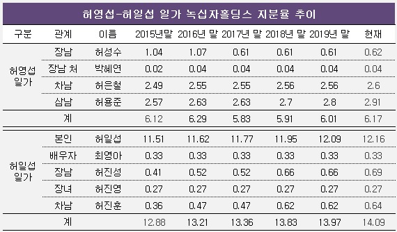 최근 5년간 허일섭 회장 일가의 지분율은 12.88%에서 14.09%로 높아졌다. 허 회장 측근으로 분류되는 박용태 부회장(4.87%) 지분을 더하면 지배 지분율은 18.96%로 오른다.