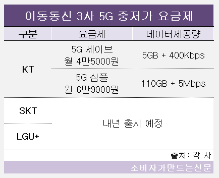 현재 통신 3사 중 5G 중저가 요금제를 출시한 곳은 KT가 유일하다. 요금제 종류에 따라 ▲월 4만5000원, 5GB 제공 ▲월 6만9000원, 110GB 제공으로 나뉜다. SK텔레콤과 LG유플러스는 이르면 내년 초 5G 중저가 요금제를 내놓을 것으로 보인다.