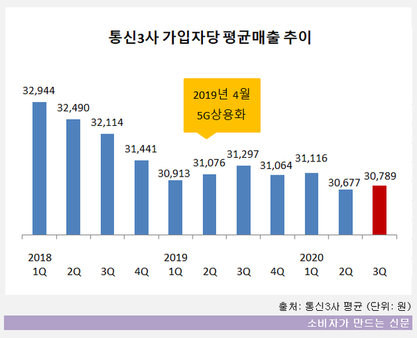 4일 업계에 따르면 통신3사 무선 ARPU는 올 3분기 3만789원으로 집계됐다. 2년 전 3만3000원대에 육박했으나 지난해 시장이 포화되면서 점차 하락세를 보이기 시작해 2019년 말 (3만1064원)보다도 더 떨어진 것이다.