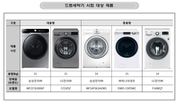 평가 대상은 삼성전자의 'WF21T6300KP'(대용량)와 'WF14F5K3AVW1'(중용량), 위니아전자 'DWD-15PDWC'(중용량), LG전자 'F21VDZ'(대용량), 'F14WQT'(중용량)이다.