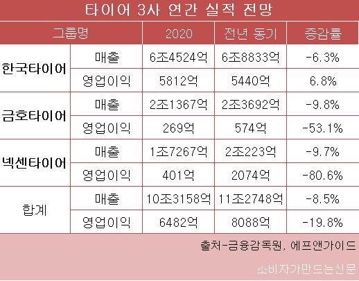 금융정보업체 에프앤가이드에 따르면 타이어 3사의 올해 매출은 총 10조3158억, 영업이익은 총 6482억 원으로 추정된다. 지난해에 비해 매출은 8.5%, 영업이익은 19.8% 감소한 수치다.