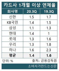 지난해 연체율이 가장 높았던 하나카드는 2.3%에서 0.6%포인트 하락한 1.6%를 기록했으며 우리카드와 신한카드 역시 지난해 각각 1.8%, 1.7%에서 올해 1.3%, 1.5%로 개선됐다.