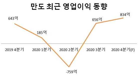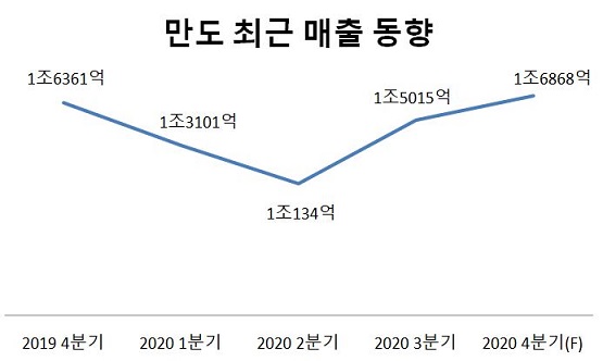 금융정보업체 에프앤가이드에 따르면 만도는 4분기에 매출 1조6868억, 영업이익 834억 원을 거둘 것으로 전망된다.