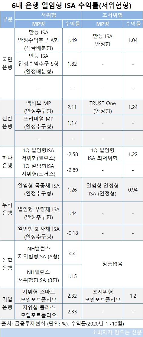 중위험 유형에서는 NH농협은행이 6대 은행 중 가장 높은 3.03~3.76%의 수익률을 기록했다. 초고위험과 고위험 유형에서 가장 높은 수익률을 기록한 KB국민은행은 중위험 유형에서는 만능ISA시장중심형 상품이 마이너스 수익률을 기록하는 부진을 보였고 하나은행(행장 지성규)과 IBK기업은행도 일부 상품이 손실을 기록했다.