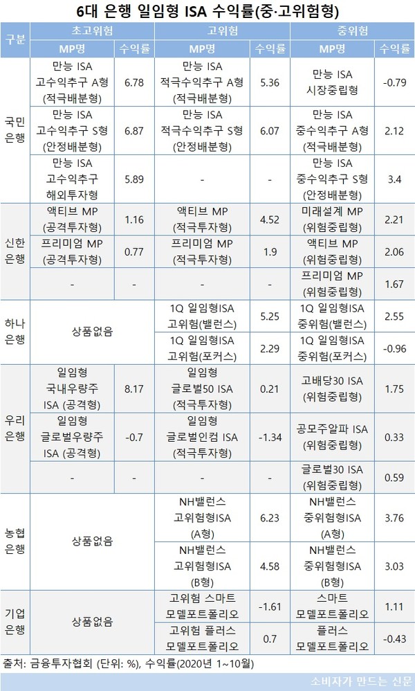 6대 시중은행의 일임형 ISA상품의 올해 수익률을 살펴본 결과 고위험 유형에서는 KB국민은행, 중위험 유형에서는 NH농협은행, 저위험 유형에서는 IBK기업은행의 수익률이 가장 높았다.