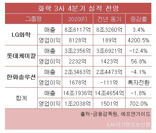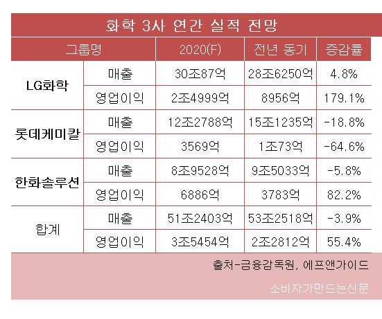 금융감독원과 금융정보업체 에프앤가이드에 따르면 화학 3사는 올해 총 매출 51조2403억 원, 영업이익 5454억 원을 거둘 전망이다. 전년 대비 매출은 3.9% 줄고 영업이익은 55.4% 늘어나는 수치다.