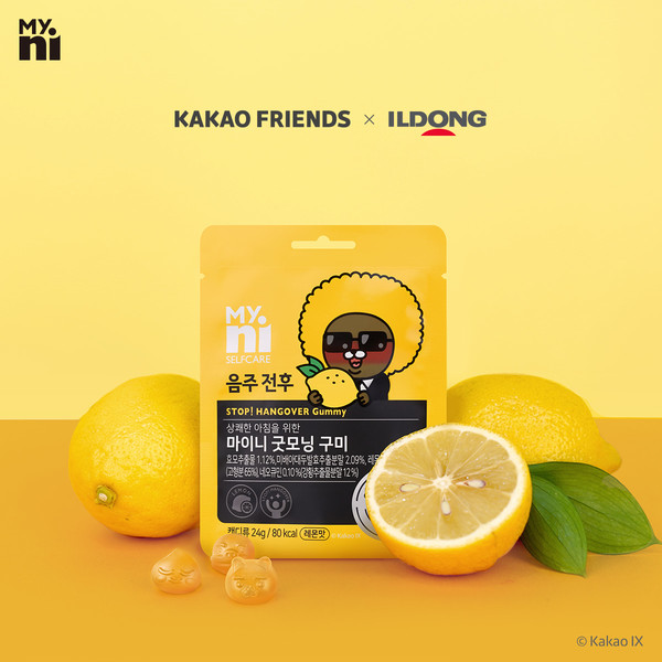 마이니 굿모닝 구미는 효모추출물, 미배아대두발효추출분말, 네오큐민(강황추출분말) 등의 원재료에 레몬농축액으로 상큼한 맛과 향을 살린 숙취해소 젤리다.