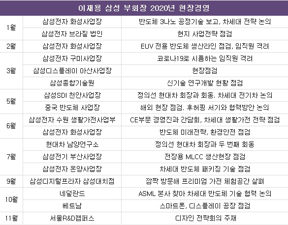 삼성 이재용 부회장은 올해 첫 업무를 화성사업장 현장에서 시작했고 2월 코로나19 사태 이후에도 거의 매달 국내외 현장을 방문하는 등 총 17번에 결쳐 현장을 찾았다.