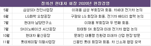 5월 삼성SDI(대표 전영현) 천안사업장에서 이재용 부회장을 만난 것을 시작으로, 6월 LG화학(대표 신학철) 오창공장에서 구광모 회장, 7월 SK이노베이션(대표 김준) 서산공장에서 최태원 회장과 만나 전기차 배터리 협력 방안을 논의했다.