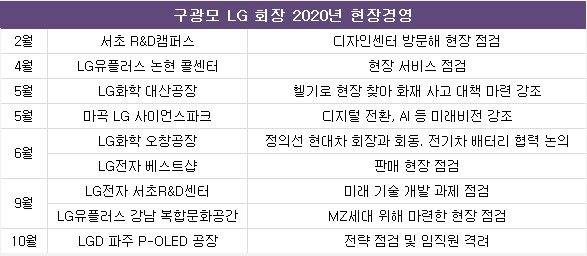 구광모 LG 회장은 올 들어 고객 접점’과 ‘미래준비’에 중점을 두고 현장 경영 행보를 이어갔다. 현장을 찾을 때는 동행 인원을 최소화하는 등 실용주의 경영철학을 실천 중인 것으로 전해진다.
