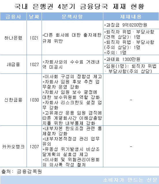 제재 대상 금융사는 지난 10월에 하나은행(행장 지성규)과 JB금융지주(회장 김기홍)가 일반 제재를 받았으며, 경영유의는 지난 10월 신한금융지주(회장 조용병)와 이달 7일에는 카카오뱅크(대표 윤호영) 등으로 확인됐다.
