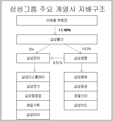 삼성은 이재용 부회장→삼성물산→삼성생명→삼성전자로 이어지는 지배구조를 갖추고 있다.