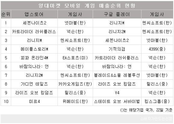 넥슨은 양대마켓 모두 고르게 선전하며 업계 1위의 저력을 발휘했다. 애플 앱스토어 매출 톱10에 올라온 국산 게임 7개 중 절반에 가까운 3개가 넥슨 게임이다. 구글 플레이 스토어에서도 마찬가지로 3개가 넥슨 게임이었다.