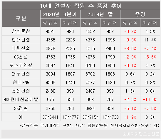 기간제 직원 수는 현대건설과 포스코건설, 삼성물산 건설 부문, 현대엔지니어링이 증가세를 이끌었다.
