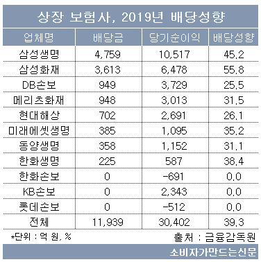 올해 보험사들이 호실적을 기록한 것 역시 배당성향 확대 요인이다. 삼성생명은 이미 3분기 누적 순이익 9951억 원을 기록해 올해 ‘1조 클럽’을 달성할 것으로 보이며 삼성화재 누적 순이익 역시 6289억 원으로 전년 동기 대비 7.3% 늘었다.
