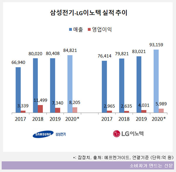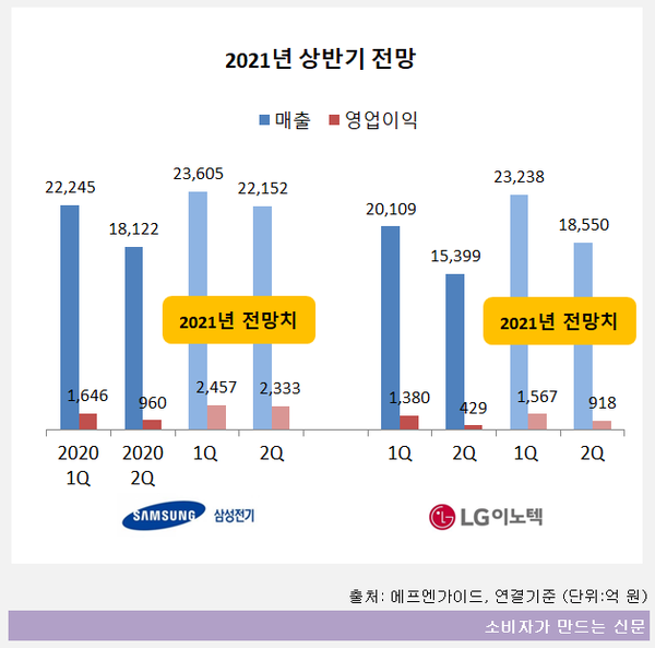 삼성전기는 지난 2분기 코로나19로 모듈 수요가 줄어 실적이 주춤한 바 있다. 다만 고성능 카메라 모듈 공급과 5G 신모델 출시 효과로 내년 1분기 매출은 2조3605억 원, 영업이익은 2457억 원으로 크게 늘어날 전망이다.