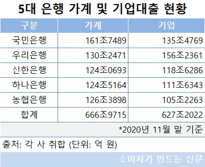 지난달 기준으로 KB국민은행, 신한은행, 우리은행, 하나은행, NH농협은행 등 5개 은행의 기업대출 잔액은 627조 2022억 원으로 같은 기간 가계대출 잔액인 666조9715억 원보다 40조 원가량 적다.