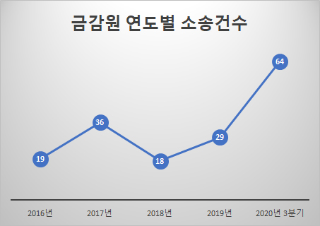 금감원 측은 “올해 3분기까지 64건의 소송 건 가운데 41건이 한 사람의 부작위위법확인 등 민원성 소송”이라며 “전체 소송건수가 늘어난 주요 원인”이라고 설명했다.