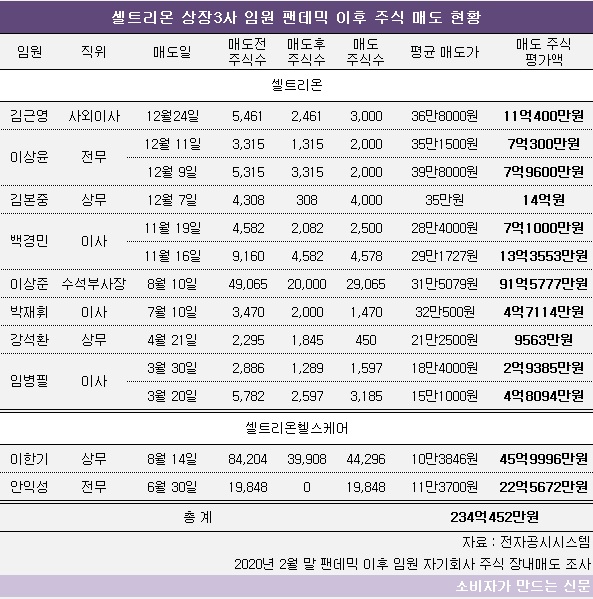 전자공시시스템에 따르면 셀트리온 이상준 수석부사장 등 임원 7명과 김근영 사외이사 등 총 8명은 지난 3월 20일부터 12월 24일까지 총 11차례에 걸쳐 165억4784만 원어치 주식을 매도했다. 셀트리온헬스케어 임원 2명도 6월과 8월 68억5668만 원치 주식을 팔았다.
