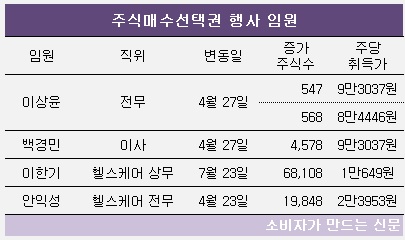 이한기 상무는 7월 주당 1만649원에 6만8108주를 주식매수선택권으로 취득했다. 이후 8월 보유 중이던 8만4204주의 53%에 해당하는 4만4296주를 10만3846원에 팔아 큰 차익을 봤다.