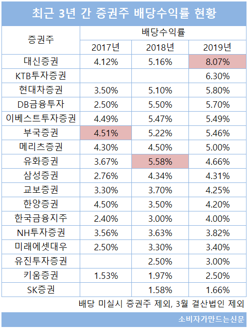 이 외에도 현대차증권(대표 최병철), DB금융투자(대표 고원종), 이베스트투자증권(대표 김원규), 메리츠증권(대표 최희문) 등 지난해 5% 이상 배당수익률을 기록한 증권주들이 올해도 비슷한 기조를 보일 것으로 예상된다.
