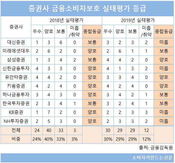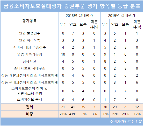 금융감독원이 실시한 2019 금융소비자보호실태평가(이하 실태평가)에서 금융투자업권은 '우수', '양호', '보통' 평가 비중이 균등하게 이뤄지면서 기존에 비해서는 변별력이 높아졌다.