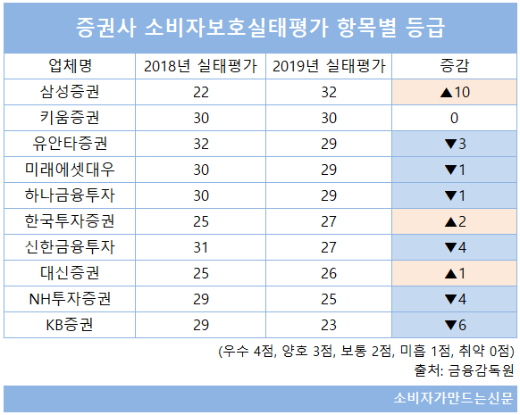 반면 KB증권은 29점에서 23점으로 6점 하락해 전년 대비 점수 하락폭이 가장 컸고 2019 실태평가에서도 가장 낮은 점수를 받게 되었다. 종합등급도 '양호'에서 '미흡'으로 2단계나 떨어졌다.