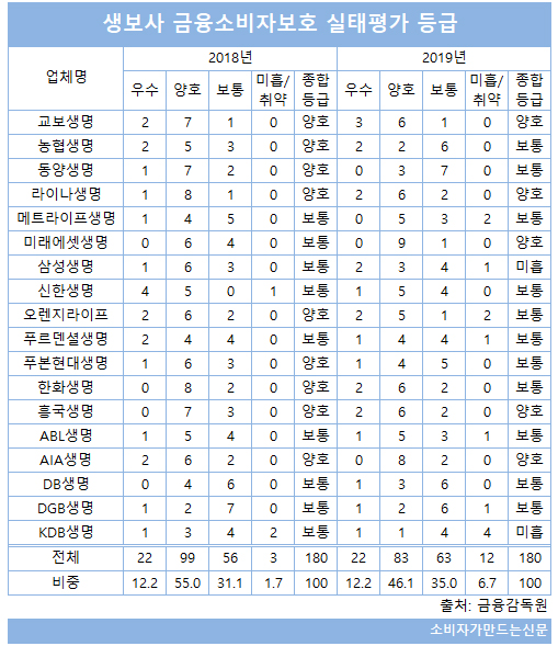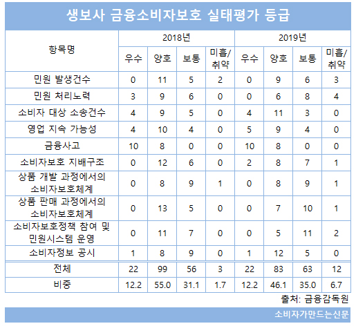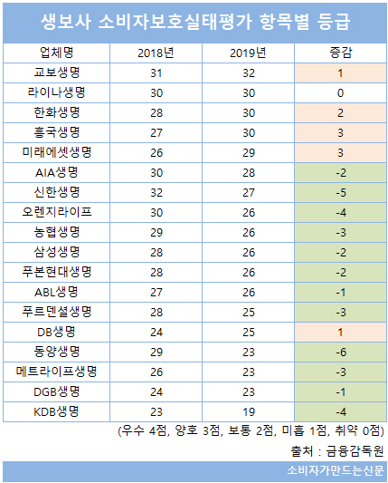 2019년 금융소비자실태평가에서 생명보험사들은 대체로 지난해보다 낮은 등급을 받았다.