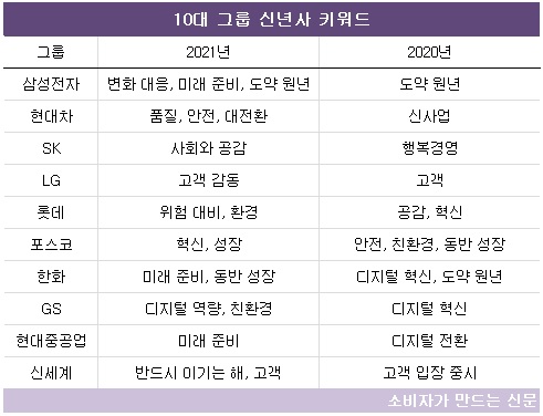 지난해의 경우 10대 그룹 신년사에서 디지털 혁신이 대세를 이뤘지만, 올해는 코로나19로 인한 어려움이 지속되는 상황에서 미래 준비와 함께 사회적 가치에 무게가 실렸다.